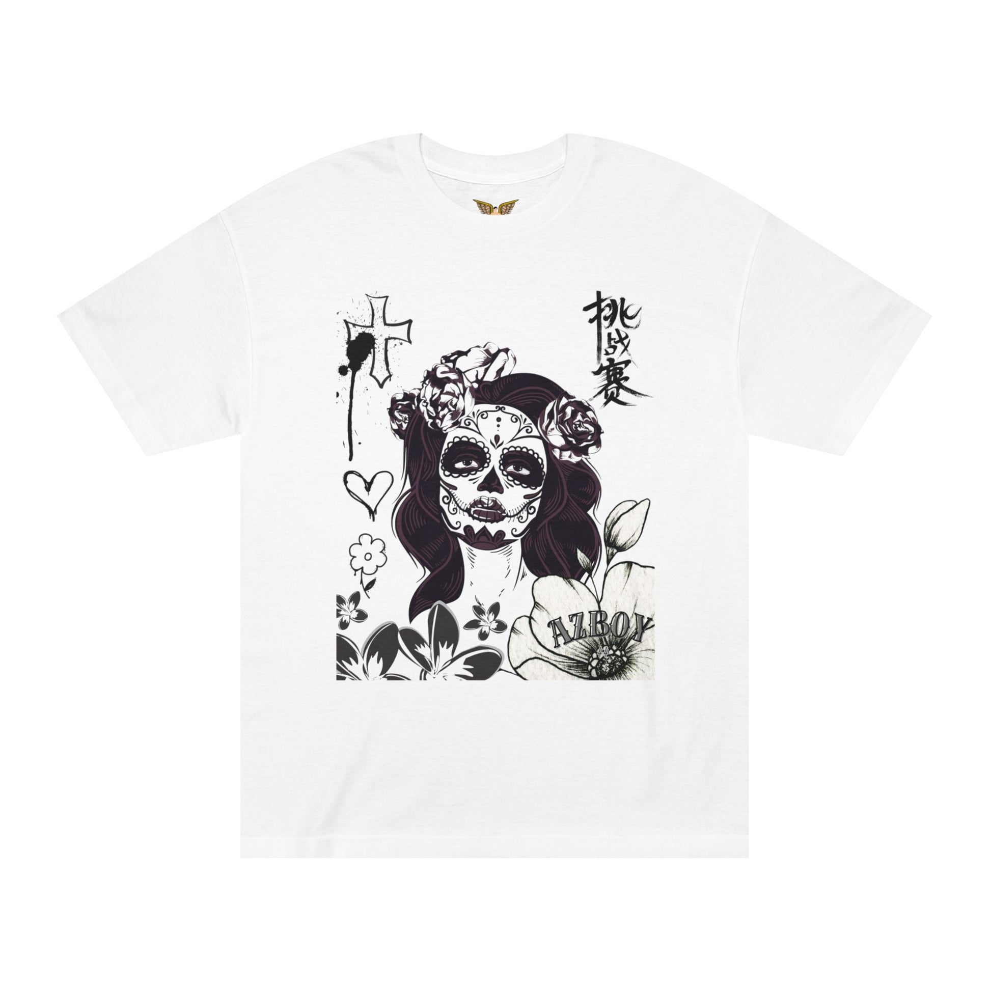 An edgy graphic tee featuring a Day of the Dead Skull design, perfect for those who love alternative fashion. This classic AZBOY T-Shirt is a great Halloween gift and showcases unique sugar skull art. The tee offers a classic fit and medium fabric weight, making it comfortable and durable. Ideal for individuals who appreciate bold and unique designs, perfect for Halloween celebrations and alternative fashion enthusiasts.