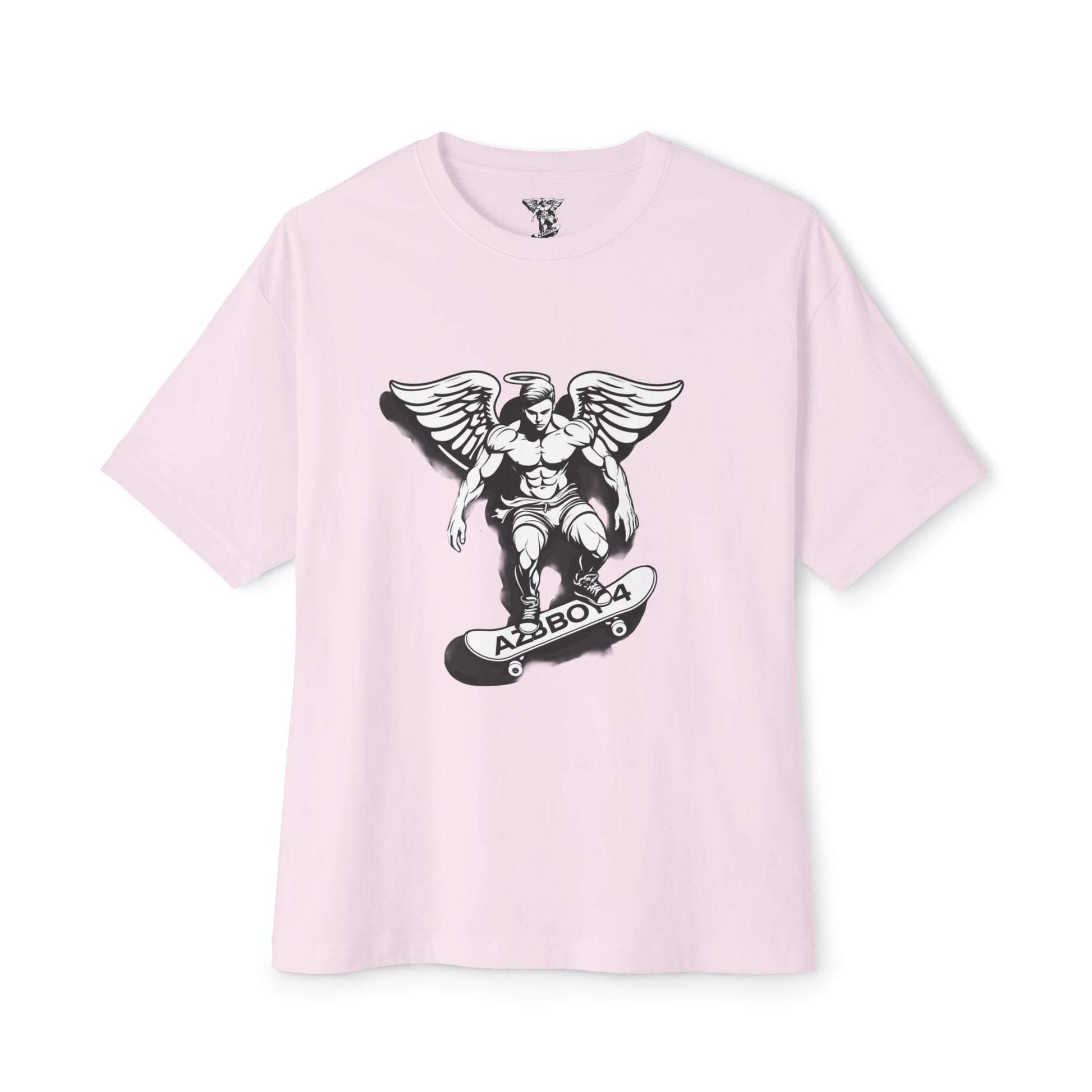 AZBOY44 logo Skateboard Angel graphic tee, unisex oversized T-shirt perfect for streetwear fashion. Ideal gift for skaters and great for casual wear. Gives off a cool, edgy vibe. Relevant for skaters, streetwear enthusiasts, and those who appreciate unique graphic tees. Perfect for birthdays, Christmas, and everyday wear.