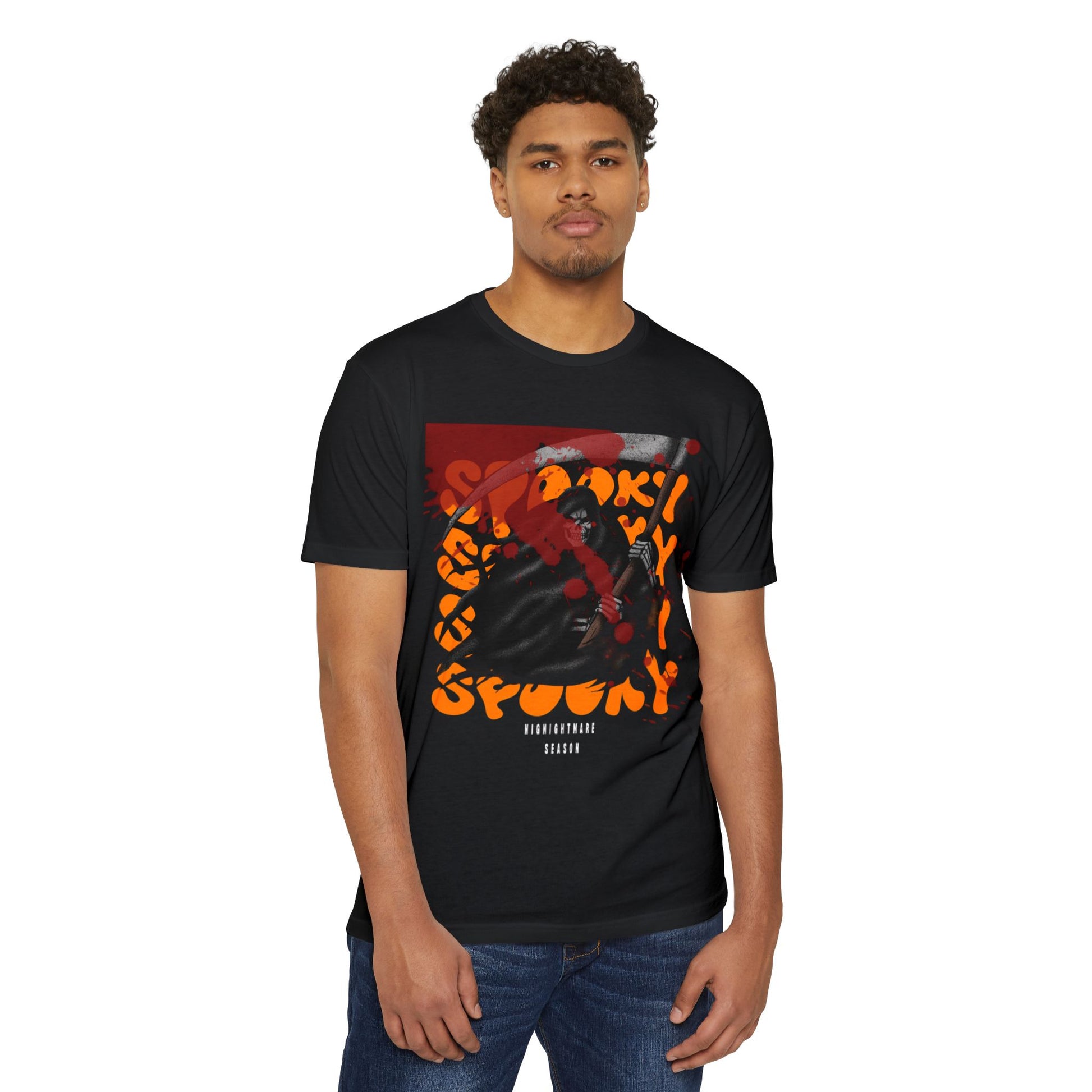 Spooky Graphic T-Shirt, Halloween Tee, Casual Fall Wear, perfect for Trick or Treat. Gives off a spooky and festive vibe, perfect for Halloween enthusiasts. Relevant for Halloween celebrations and fall activities.
